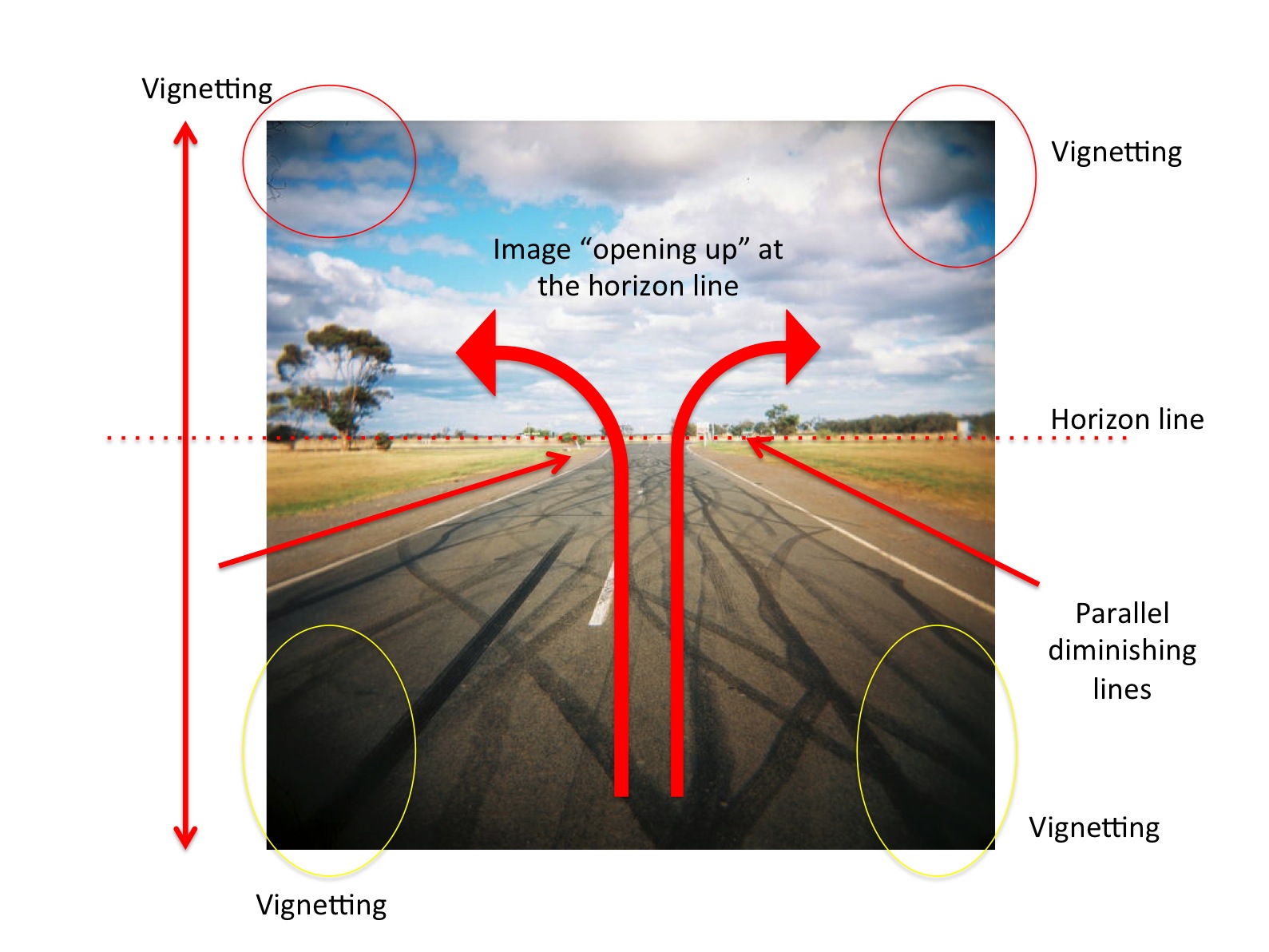 The image is a simple, uncluttered execution. Holga cameras are perfect for capturing these kind of urban landscapes – the plastic lens brings the interest to the right composition. Decay is a theme the Holga was built with in mind. The tyre marks suggest this theme to me.