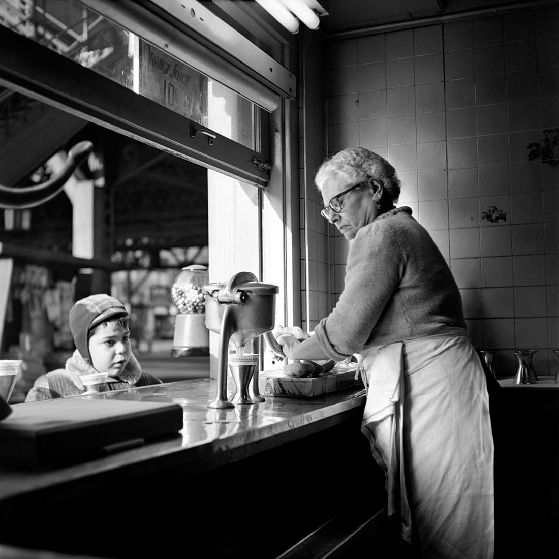 October 31, 1954. New York, NYThe Night Market image incorporates the two techniques of framing and changing perspective – specifically breaking the “fourth wall” of an image by getting behind the scene. Not a perfect use of the phrase “fourth wall” but I think it gets the point across. Walking behind the stalls provided the action for the camera.