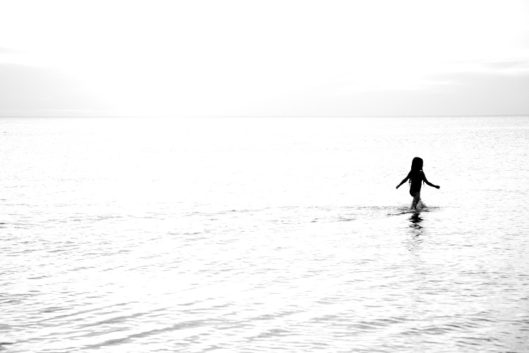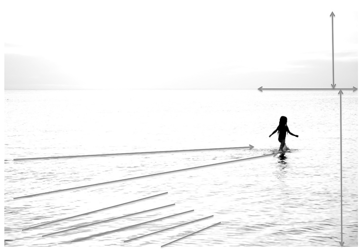 The subject’s figure to ground ratio is very high – her silhouette contrasts easily with the water, making it the feature of the image. This is supported by two leading lines, the ripples from her movement across the water – which I positively love! They form a natural pointer to the subject, leading the viewer’s eye easily. The additional parallel lines in the bottom left corner, created by the waves, assist in creating a dynamic image.