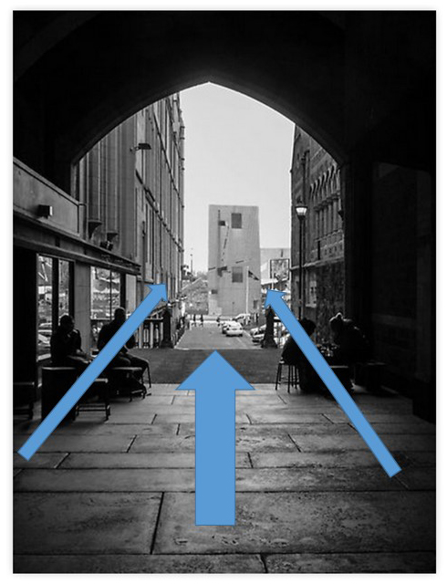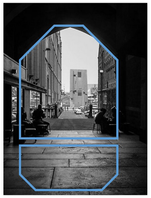 The viewer’s eye is then brought straight back down by the frame formed by the roof of the building. The frame is almost mirrored by the shadowing on the pavement in the foreground.