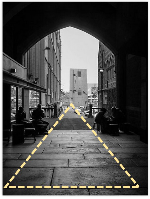 The placement of the subjects along the natural plane of the leading triangle shape leading into the distance draws the viewer’s eye from the bottom of the image, and leads it towards the apex. The isolated rectangular building at the top of the pyramid gives a solid stop to the image.