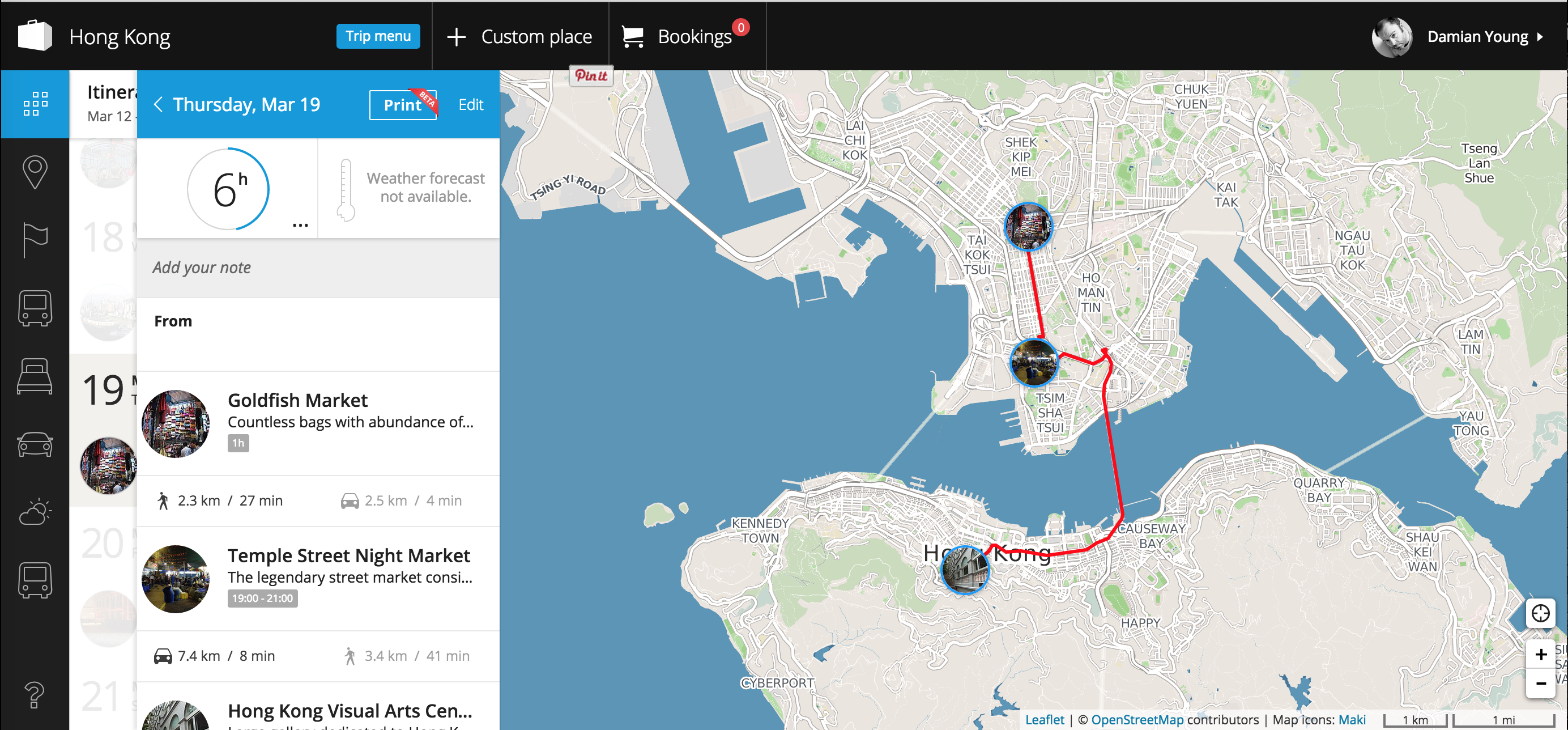 The only downside is that not all the places you want to go will pre-exist in the app. In this case, just import the GPS co-ordinates from google maps and create a custom place. For each location you can add notes, links, and whatever else you need. Here is an example of a day I had planned out for my last trip to Hong Kong.
