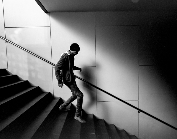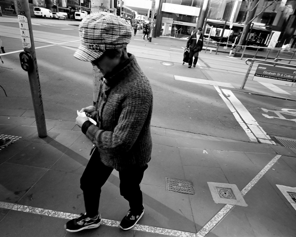 Another zone focus experience. I found the spot first, an entrance to Melbourne Central, where the light was perfect. It was then just a wait until the right subject came along. The camera was set prior to the shot – both the framing and the focus – all I had to do was pull the camera up to my eye and shoot. There were three or four shots that worked here, but this subject’s slightly “unco” feet make the composition interesting.