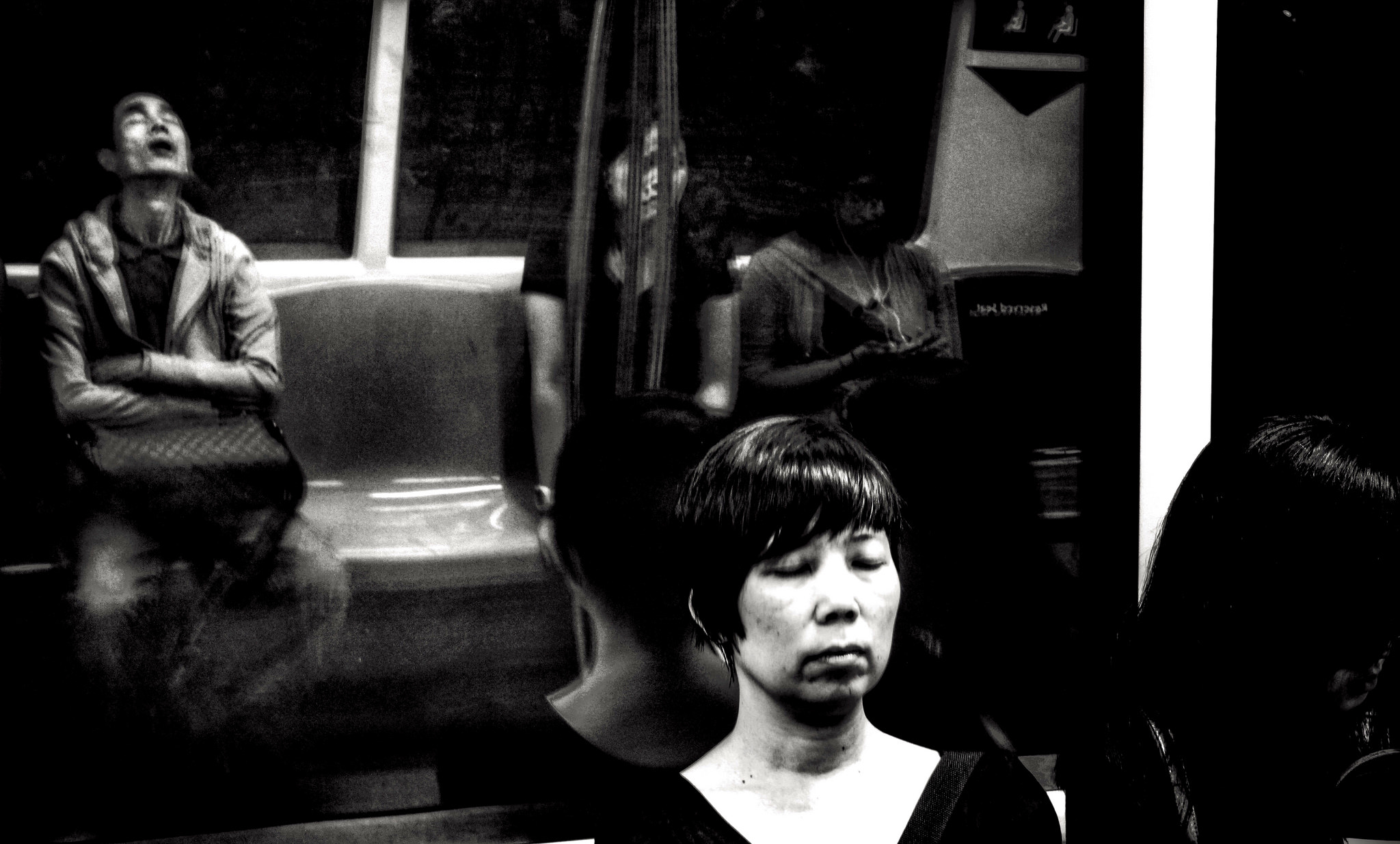 What a great image. Sharpness is not always critical to a powerful image. The relatively slow shutter speed in the low light blur adds to the general feeling of exhaustion and tiredness of the subjects. The male subject, asleep at the rear of the image is a reflection, but is not instantly recognisable as such. It creates a layer of interest in the image.