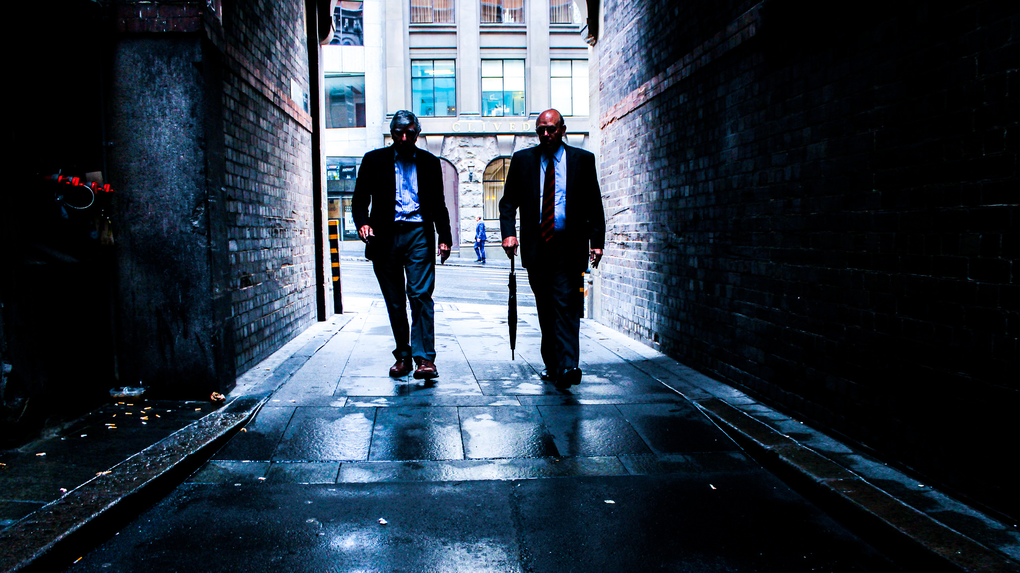 The second image is another creatively inspired application of the light conditions offered by laneways. The foreground of the image is beautifully dark, and mysterious. The eye is then led directly to the two subjects who, at first, are mostly silhouettes until your eye adjusts to the low light and starts to pick up on the detail.