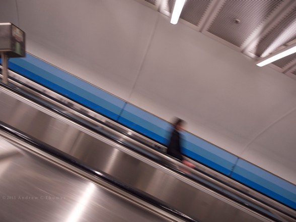 Focus is overated! Well, in this case, it is more about capturing motion through blur. The stainless steel lines of the escalator at Parliament Station run on an aesthetically pleasing angle, highlighted by the blue lines in the background of the shot which run parallel. The simple silhouetted image ensures there is little visual distraction – focusing in idea of the person moving down…